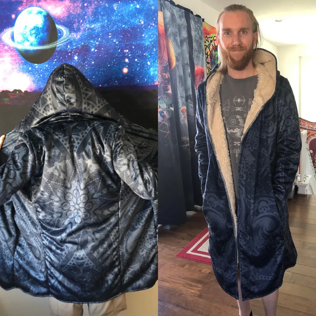 The inside of our Dream Cloak is crafted with your choice of either Ultra-Soft Plush Sherpa or our Cosmic Faux Fur. The outside is crafted with Micro-Mink Polyester that allows us to print high definition art with intense vivid colors. Dream Cloaks feature two deep side pockets to hold all your stuff securely and Button Closures on the front. Our Dream Cloaks are completely made by hand in our Electro Factory in Utah.